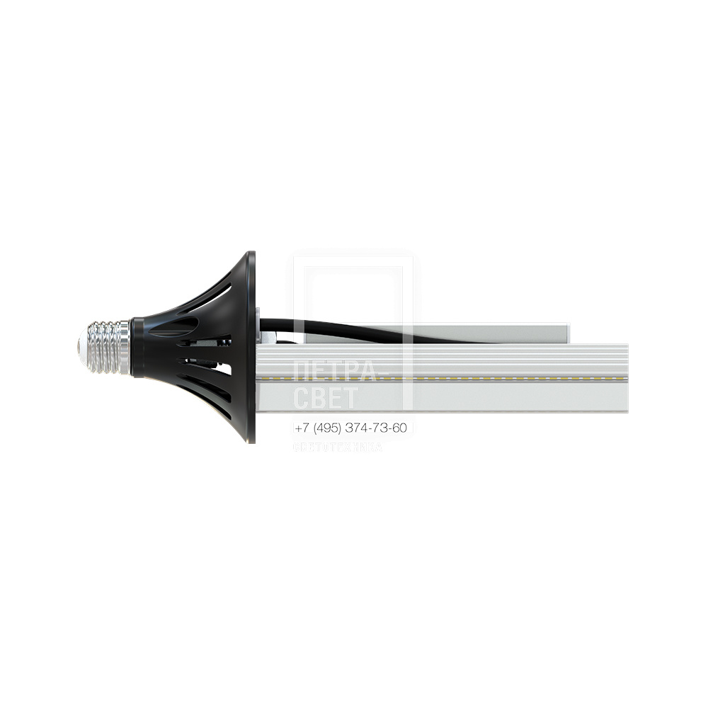 Серия светодиодных цокольных ламп для освещения: • промышленных и подсобных помещений, • придомовых и парковых территорий. Серия призвана заменить устаревшие ДНаТ-лампы. Световая отдача достигает 165 лм/Вт. Лампы просты в монтаже, надёжны и имеют долгий срок службы. Они не содержат ртуть, не требуют дезактивации и захоронения на специализированных полигонах промышленных отходов. Особенность серии: лампы Е27-Д создают направленное освещение благодаря специальному поворотному механизму, который позволяет регулировать положение светодиодного модуля. Это особенно актуально при установке ламп, близкой к горизонтальной, когда всестороннее освещение не требуется. [Корпус] Экструдированный корпус из анодированного алюминия разработан специально под данную серию ламп. Он имеет значительную площадь поверхности (за счёт рёбер и волнообразных изгибов), что способствует эффективному теплоотведению. Специальный поворотный механизм позволяет менять положение модуля со светодиодными планками. [Светодиодный модуль] В лампах используются светодиодные планки на алюминиевой подложке, изготовленные по технологии SMT. [Источник питания] Источник питания внешнего исполнения в металлическом корпусе (IP67) залит теплопроводящим компаундом и защищён от микросекундных импульсов высокой энергии от 1 кВ. Источник располагается непосредственно на корпусе лампы. [Крепление] Лампы устанавливаются с помощью стандартного цоколя Е27. После установки можно отрегулировать положение модуля со светодиодными планками.