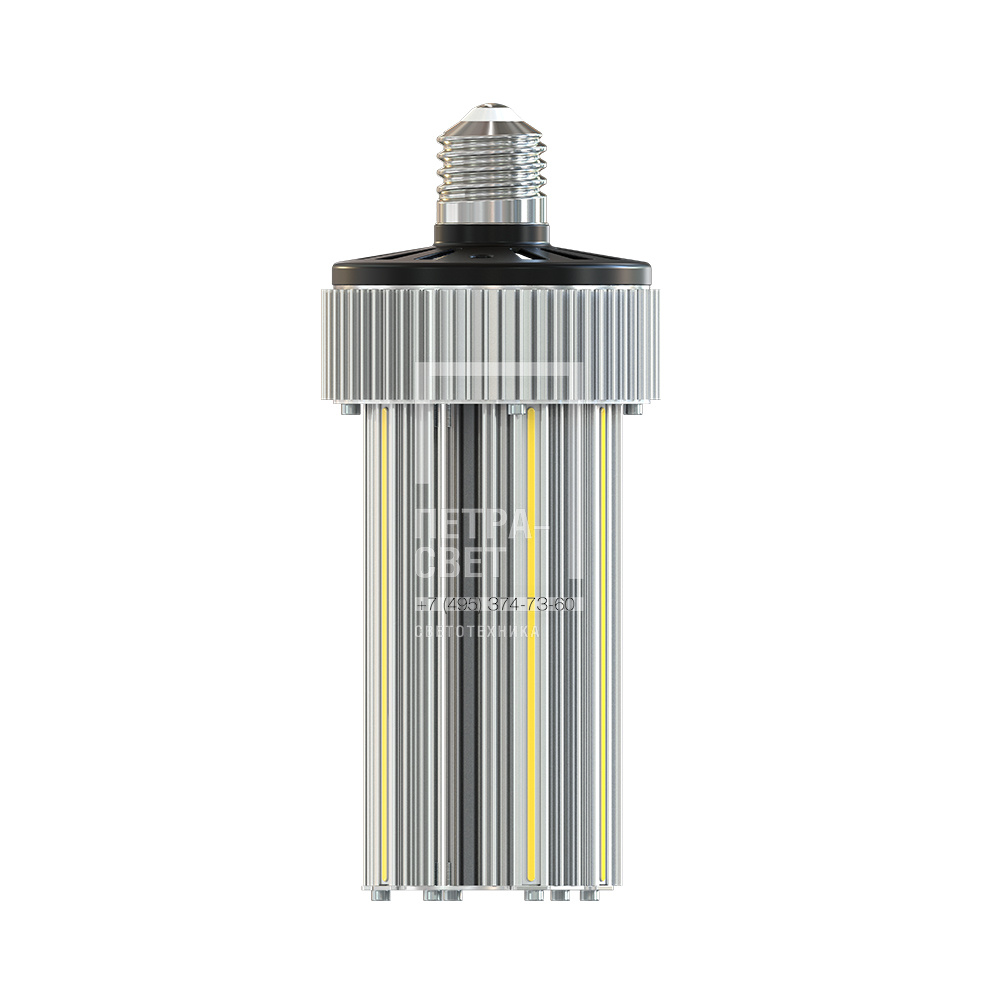 Серия светодиодных цокольных ламп для освещения: · промышленных и подсобных помещений, · придомовых и парковых территорий. Серия призвана заменить устаревшие ДНаТ-лампы.Конструкция корпуса обеспечивает эффективный теплоотвод от светодиодов, обеспечивая надёжность и долгий срок службы ламп. Лампы КС Е40-C отличаются выгодной ценой за люмен и легкостью в монтаже. [Светодиодный модуль] В лампах мощностью 80 Вт используются\ светодиодные планки с COB-диодами. [Корпус] Экструдированный корпус из анодированного алюминия с большой площадью отдачи тепла (за счёт рёбер и волнообразных изгибов). [Источник питания] В лампах мощностью 30-60 Вт установлено по одному защищённому от микросекундных импульсов высокой энергии источнику питания в пластиковом корпусе. Располагаются источники внутри основного корпуса, между рёбрами. В лампах мощностью от 80 Вт бескорпусный источник питания, также защищённый от микросекундных импульсов высокой энергии, устанавливается в специальный алюминиевый отсек, который располагается между цоколем и основным корпусом. Отсек полностью заливается теплопроводящим компаундом для отвода тепла от источников питания и диодов. [Крепление] Лампы устанавливаются с помощью стандартного цоколя Е40.
