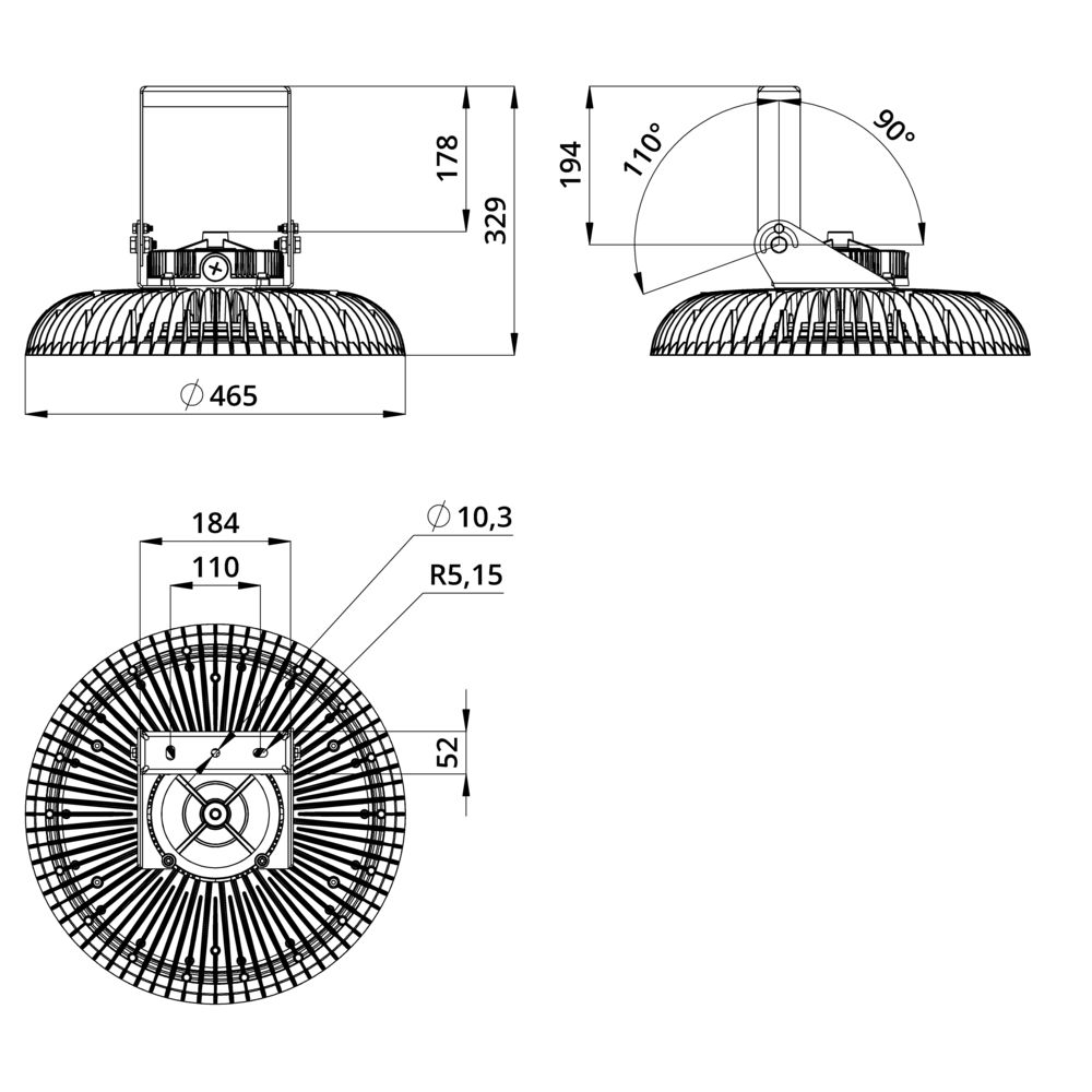 Габаритные размеры, не более, [мм] Ø465×329 (кронштейн со светильником)