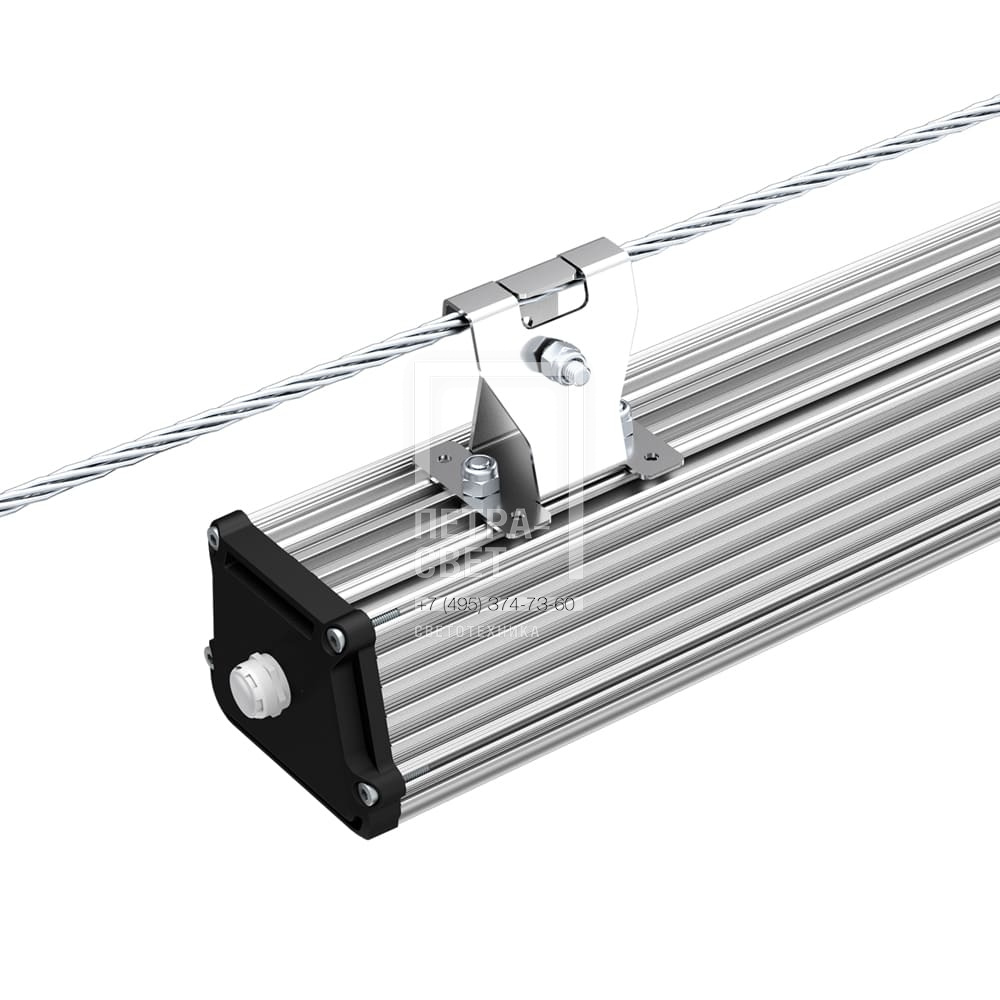 Крепление собственной разработки и производства позволяет подвесить и закрепить светильник на горизонтальный трос.