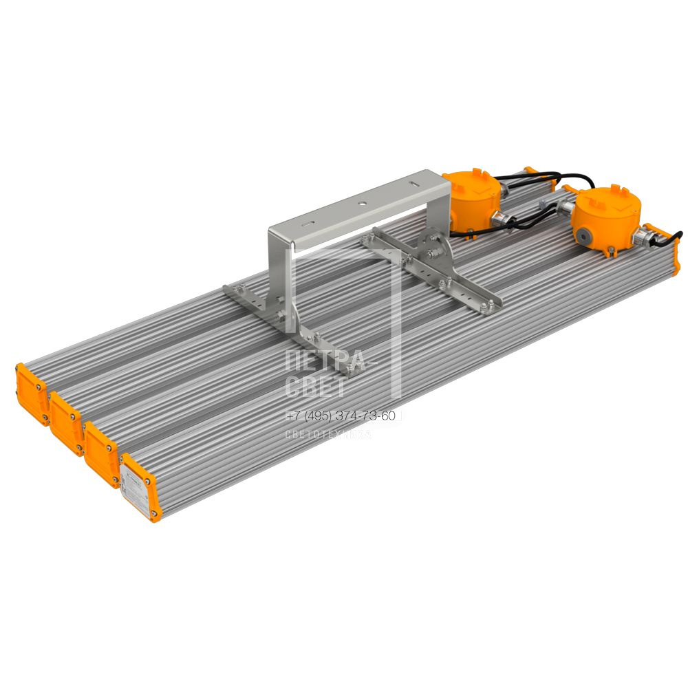 Серия линейных светодиодных светильников для освещения взрывоопасных зон класса 2. Светильник относится к электрооборудованию повышенной надежности против взрыва. [Маркировка взрывозащиты] 2 Ex nR IIC T6 Gc X/Ex tc IIIC T85C Dc X. [Структура наименования] Т-Линия v2.0 Ex - X1Y1 - 220 - X2 - X3 - X4Y2 - X5 - Y3. параметры X — обязательные, параметры Y — опциональные: X1 — номинальное значение электрической мощности; X2 — обозначение типоразмера светильника; X3 — тип крепления; X4 — исполнение оптической части; X5 — четырехзначный световой код (первые 2 цифры — КЦТ, вторые — CRI); X6 — комплектация блоком аварийного питания. Y1 — опция наличия коммутационной коробки и проходного подключения; Y2 — опция комплектации защитной решеткой; Y3 — опция интерфейса управления. U — Обозначение диапазона напряжения питания для низковольтных светильников. [Конструкция и материалы] Экструдированный корпус изготовлен из анодированного алюминия, устойчивого к коррозии, имеет торцевые металлические крышки с силиконовым уплотнителем. Большое количество ребер обеспечивает эффективный теплоотвод. Светодиодная плата изготовлена по технологии SMT с применением большого количества высокоэффективных светодиодов. Исполнение «Оптик» с прозрачным рассеивателем представлено с широким набором оптик (10°, 15°, 25°, 50°, 90°, 10х70°) за счет применения индивидуальных линз из ПММА, устанавливаемых на каждый светодиод. Эффективные источники питания защищены от микросекундных импульсов высокой энергии. [Особенности серии] • Световая отдача — до 143 лм/Вт. • Цветовые температуры — 3000, 4000, 5000 К. • Степень защиты от пыли и влаги — IP66. • Температура эксплуатации — от -40 до +50 °С. • Оптики — 10°, 15°, 25°, 50°, 90°, 10х70°. • Возможные крепления — на трос, на винт-петлю, на шпильку, на трубу (консоль), на кронштейн, на защелки J-Hook. [Опции и аксессуары] При необходимости светильник может быть оснащен взрывозащищенной распределительной коробкой для организации электрического подключения. Опционально взрывозащищенная коробка может быть оснащена одним или несколькими гермовводами (в зависимости от длины кабеля). Для дополнительной защиты рассеивателя светильника от механических повреждений предусмотрена защитная решетка из стали. Аксессуар заказывается отдельно.