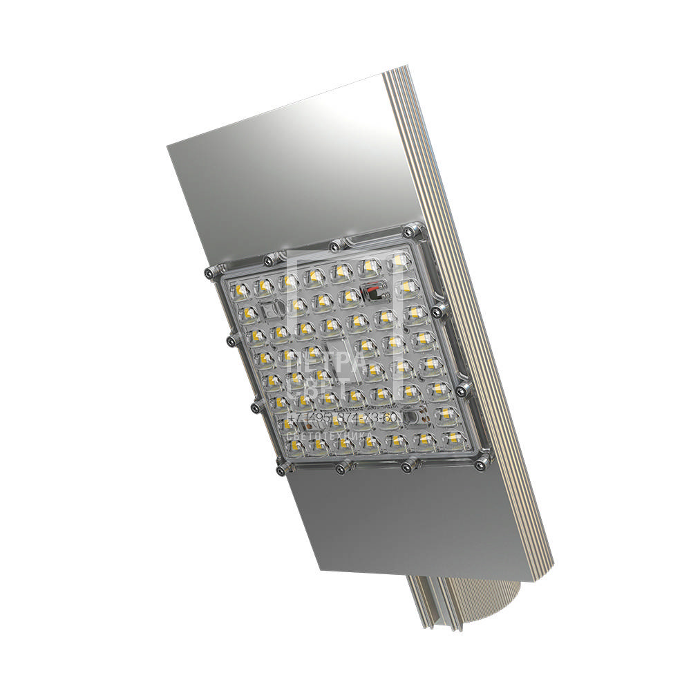 Серия наружных светодиодных светильников для освещения: • территорий СНТ и просёлочных дорог, • придомовых территорий, • скверов, • наружных промышленных зон. Светильники имеют высокую эффективность (до 170 лм/Вт) и одну из самых низких в линейке цену за люмен. В серии есть модификации «Эко» (гарантия 2 и 3 года) и «Экстра» (стандартная гарантия 5 лет). [Светодиодный модуль] Алюминиевая светодиодная плата изготовлена по SMT-технологии. Значительное количество диодов, равномерно распределённых по большой площади, обеспечивает высокую эффективность светильника. Светодиоды работают при низких токах (50% от номинальных и ниже), что повышает эффективность светильника и увеличивает срок его службы. [Корпус] Экструдированный корпус изготовлен из анодированного алюминия и имеет большую площадь отдачи тепла (за счёт ребер и волнообразных изгибов). [Источник питания] Источник питания выполнен в металлическом корпусе, залитом теплопроводящим компаундом, за счёт чего снижается нагрев его электронных компонентов, и источник служит дольше. Защита от микросекундных импульсов высокой энергии до 15 кВ. В зависимости от мощности светильника источник питания расположен либо внутри крепёжной консоли, либо на корпусе. [Линза] Линза изготовлена из УФ-стабилизированного поликарбоната. [Крепление] Светильники крепятся на консоль круглого сечения диаметром до 57 мм. В качестве аксессуаров доступны различные поворотные консольные крепления (в базовой комплектации возможности регулировки угла наклона светильников нет).
