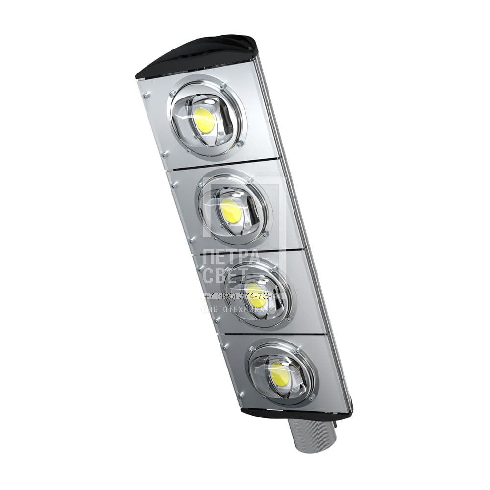 Серия наружных светодиодных светильников для освещения: • автомагистралей, • федеральных трасс и дорог местного значения, • улиц, кварталов и площадей, • наружных территорий промышленных объектов, • придомовых территорий. Светильники с энергоэффективностью до 123 лм/Вт. Преимущества серии: • боросиликатная линза, которая не мутнеет, не желтеет и не царапается; • возможность замены светодиодного модуля и источника питания без демонтажа светильника. [Светодиодный модуль] Светодиодная плата изготовлена по технологии COB. [Корпус] Экструдированный корпус изготовлен из анодированного алюминия и имеет 3 части: • основание, на которое крепится светодиодный модуль. Оно имеет рёбра охлаждения с большой площадью отвода тепла от диодов; • крышка корпуса полукруглой формы без рёбер – за счёт этого на ней не скапливаются снег, листья и прочие загрязнения; • крепёжная консоль. Конструкция корпуса позволяет менять источник питания и основание со светодиодным модулем без демонтажа светильника с опоры. [Источник питания] Источник питания в металлическом корпусе залит теплопроводящим компаундом и защищен от микросекундных импульсов высокой энергии. Источник установлен внутри светильника. [Линза] Линза изготовлена из боросиликатного стекла, которое не мутнеет, не желтеет и не царапается. Варианты оптики: 45, 60, 90, 120 и 140х85 градусов. [Крепление] Светильники крепятся на консоль круглого сечения диаметром до 57 мм. В качестве аксессуаров доступны различные поворотные консольные крепления (в базовой комплектации возможности регулировки угла наклона светильников нет).