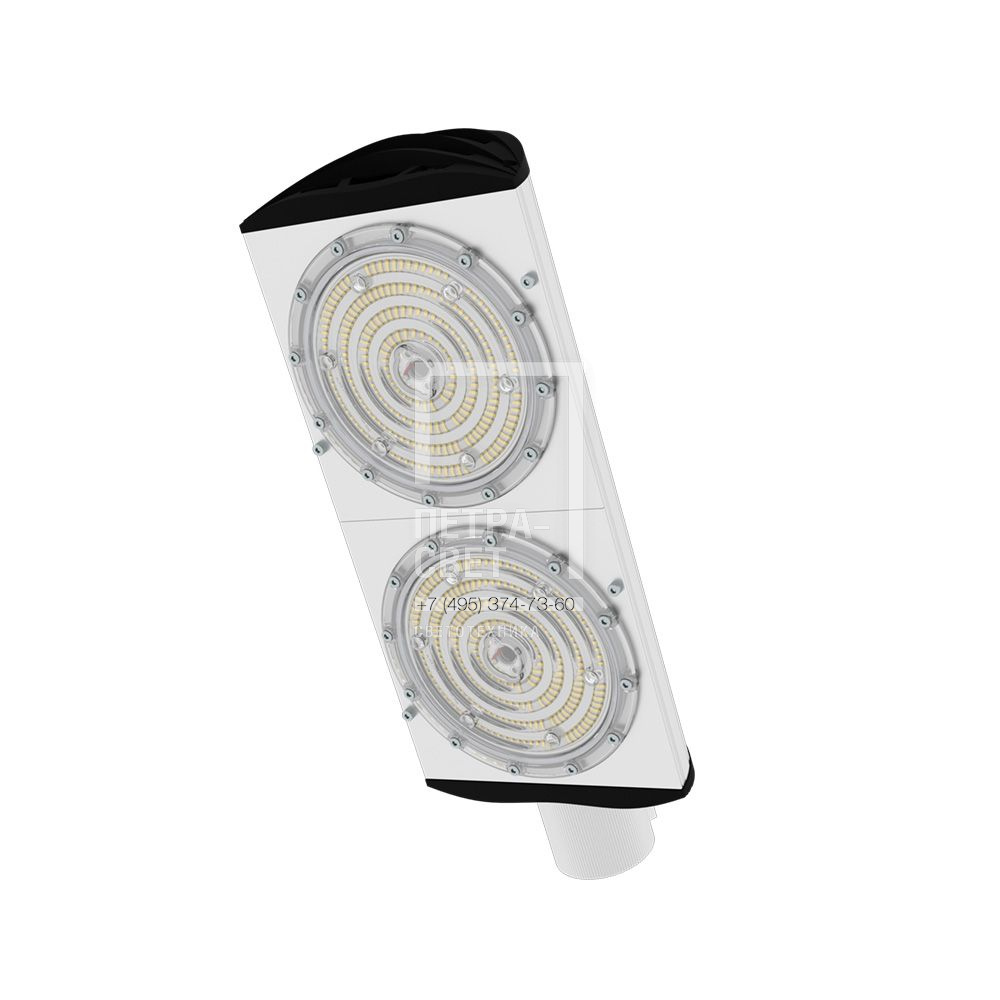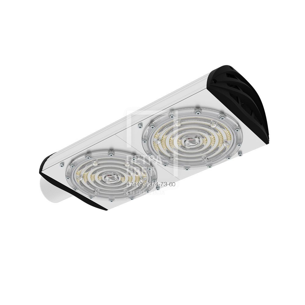 Серия наружных светодиодных светильников для освещения: • автомагистралей; • федеральных трасс и дорог местного значения; • улиц, кварталов и площадей; • наружных территорий промышленных объектов; • придомовых территорий. Преимуществом серии является возможность замены светодиодного модуля и источника питания без демонтажа светильника. [Корпус] Экструдированный корпус изготовлен из анодированного алюминия и имеет 3 части: • основание, на которое крепится светодиодный модуль. Оно имеет рёбра охлаждения с большой площадью отвода тепла от диодов; • крышка корпуса полукруглой формы без рёбер – за счёт этого на ней не скапливаются снег, листья и прочие загрязнения; • крепёжная консоль. Конструкция корпуса позволяет менять источник питания и основание со светодиодным модулем без демонтажа светильника с опоры. [Источник питания] Источник питания имеет металлический корпус, установлен внутри светильника и залит теплопроводящим компаундом. Защищен от микросекундных импульсов высокой энергии. [Светодиодный модуль] Алюминиевая светодиодная плата изготовлена по SMT-технологии. Значительное количество диодов, равномерно распределённых по большой площади, обеспечивает высокую эффективность светильника. Светодиоды работают при низких токах (50% от номинальных и ниже), что повышает эффективность светильника и увеличивает срок его службы. [Линза] Линза изготовлена из УФ-стабилизированного поликарбоната. [Крепление] Светильники крепятся на консоль круглого сечения диаметром до 57 мм. Данная серия не имеет возможности регулировки угла наклона светильников.