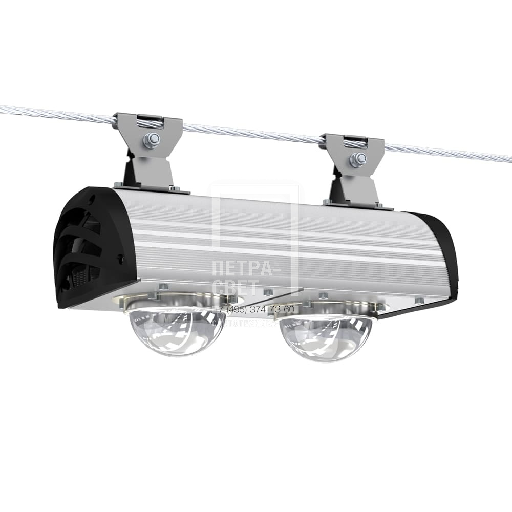 Серия светодиодных светильников для освещения: • проезжих частей, • улиц, кварталов и площадей, • наружных территорий промышленных объектов, • придомовых территорий. Светильники с энергоэффективностью 160 лм/Вт. Реализована возможность замены светодиодного модуля и источника питания без демонтажа светильника. [Светодиодный модуль] Алюминиевая светодиодная плата круглой формы изготовлена по SMT-технологии. Значительное количество диодов, равномерно распределённых по большой площади, обеспечивает высокую эффективность светильника. Светодиоды работают при низких токах (50% от номинальных и ниже), что повышает эффективность светильника и увеличивает срок его службы. [Корпус] Экструдированный корпус изготовлен из анодированного алюминия и имеет 2 части: • основание, на которое крепится светодиодный модуль. Оно имеет рёбра охлаждения с большой площадью отвода тепла от диодов; • крышка корпуса полукруглой формы без рёбер – за счёт этого на ней не скапливаются снег, листья и прочие загрязнения. Конструкция корпуса позволяет менять источник питания и основание со светодиодным модулем без демонтажа светильника с опоры. [Источник питания] Источник питания имеет металлический корпус, установлен внутри светильника и залит теплопроводящим компаундом. Защита от микросекундных импульсов высокой энергии до 6 кВ. [Линза] Линза изготовлена из УФ-стабилизированного поликарбоната. [Крепление] Светильники крепятся на трос-растяжку диаметром 4-12 мм.