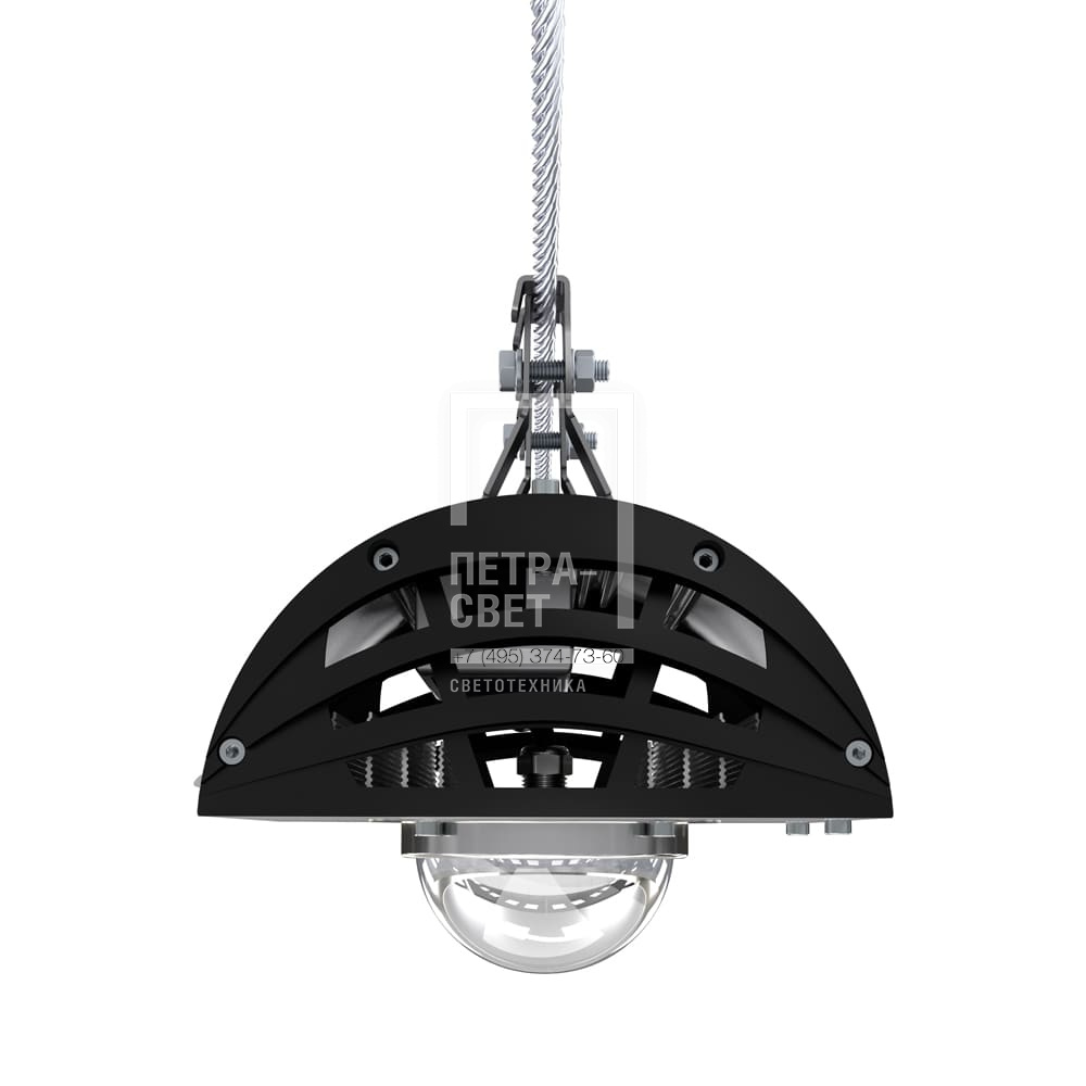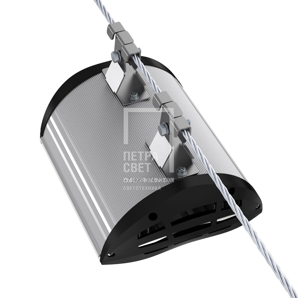 Серия светодиодных светильников для освещения: • проезжих частей, • улиц, кварталов и площадей, • наружных территорий промышленных объектов, • придомовых территорий. Светильники с энергоэффективностью 160 лм/Вт. Реализована возможность замены светодиодного модуля и источника питания без демонтажа светильника. [Светодиодный модуль] Алюминиевая светодиодная плата круглой формы изготовлена по SMT-технологии. Значительное количество диодов, равномерно распределённых по большой площади, обеспечивает высокую эффективность светильника. Светодиоды работают при низких токах (50% от номинальных и ниже), что повышает эффективность светильника и увеличивает срок его службы. [Корпус] Экструдированный корпус изготовлен из анодированного алюминия и имеет 2 части: • основание, на которое крепится светодиодный модуль. Оно имеет рёбра охлаждения с большой площадью отвода тепла от диодов; • крышка корпуса полукруглой формы без рёбер – за счёт этого на ней не скапливаются снег, листья и прочие загрязнения. Конструкция корпуса позволяет менять источник питания и основание со светодиодным модулем без демонтажа светильника с опоры. [Источник питания] Источник питания имеет металлический корпус, установлен внутри светильника и залит теплопроводящим компаундом. Защита от микросекундных импульсов высокой энергии до 6 кВ. [Линза] Линза изготовлена из УФ-стабилизированного поликарбоната. [Крепление] Светильники крепятся на трос-растяжку диаметром 4-12 мм.