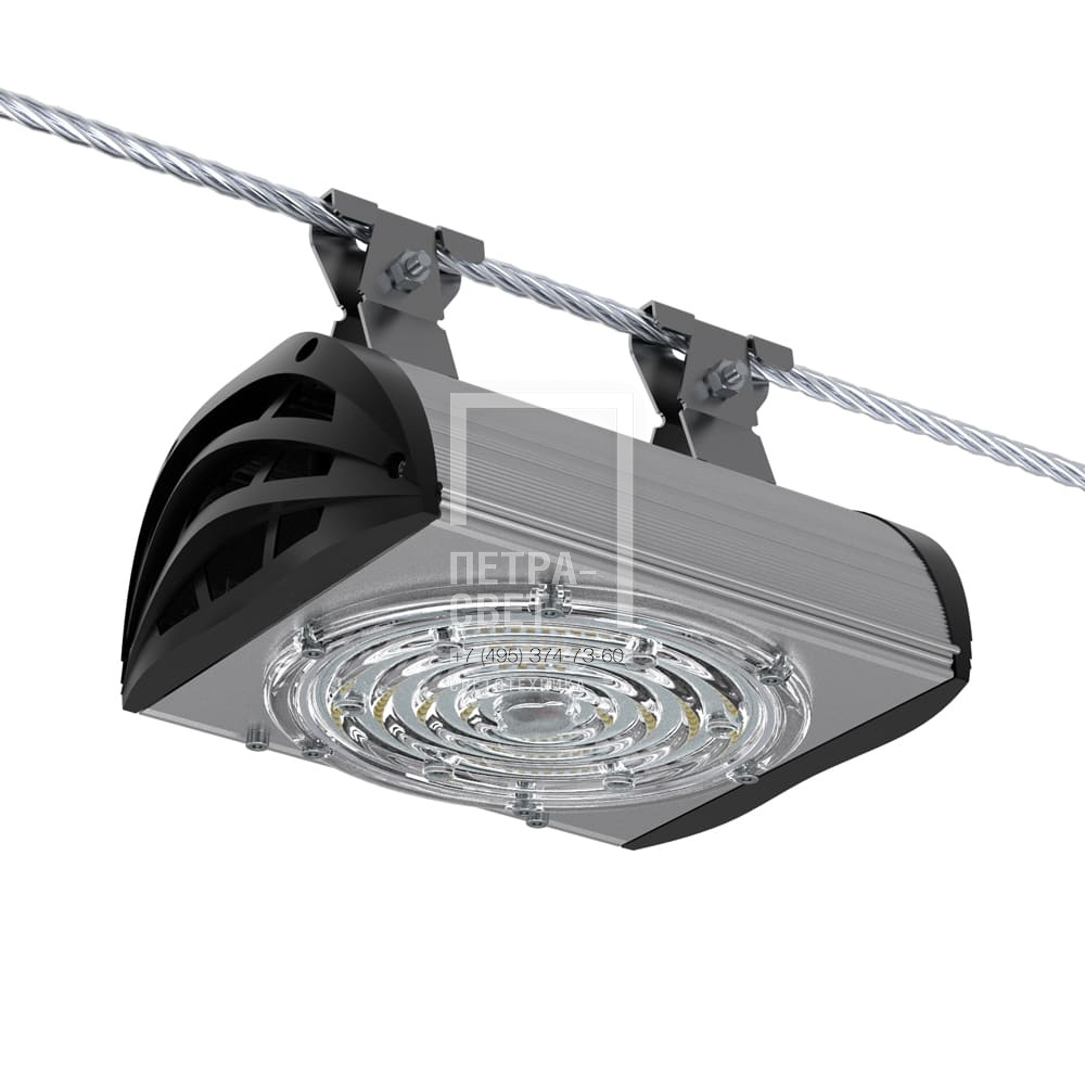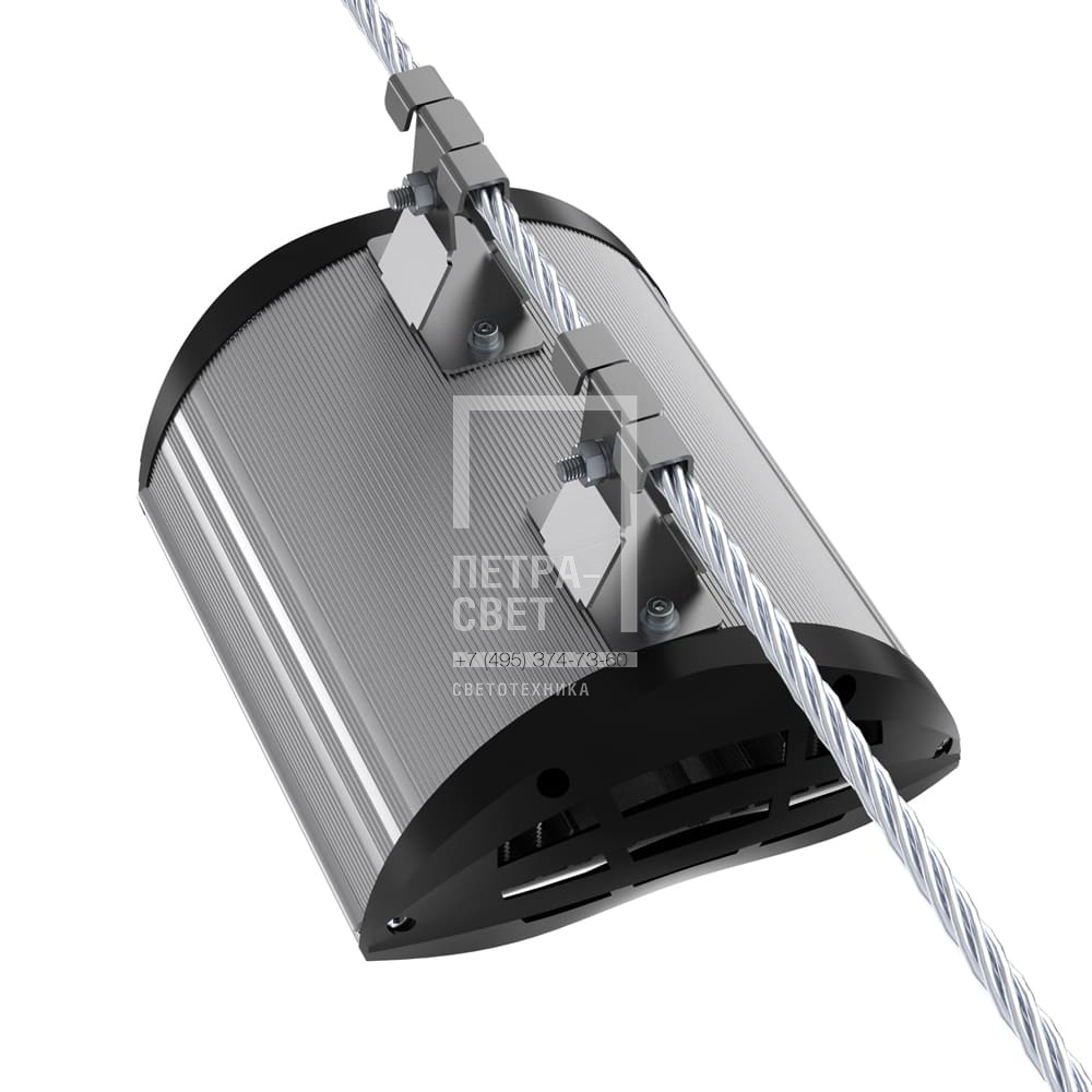 Серия светодиодных светильников для освещения: • проезжих частей, • улиц, кварталов и площадей, • наружных территорий промышленных объектов, • придомовых территорий. Светильники с энергоэффективностью 160 лм/Вт. Реализована возможность замены светодиодного модуля и источника питания без демонтажа светильника. [Светодиодный модуль] Алюминиевая светодиодная плата круглой формы изготовлена по SMT-технологии. Значительное количество диодов, равномерно распределённых по большой площади, обеспечивает высокую эффективность светильника. Светодиоды работают при низких токах (50% от номинальных и ниже), что повышает эффективность светильника и увеличивает срок его службы. [Корпус] Экструдированный корпус изготовлен из анодированного алюминия и имеет 2 части: • основание, на которое крепится светодиодный модуль. Оно имеет рёбра охлаждения с большой площадью отвода тепла от диодов; • крышка корпуса полукруглой формы без рёбер – за счёт этого на ней не скапливаются снег, листья и прочие загрязнения. Конструкция корпуса позволяет менять источник питания и основание со светодиодным модулем без демонтажа светильника с опоры. [Источник питания] Источник питания имеет металлический корпус, установлен внутри светильника и залит теплопроводящим компаундом. Защита от микросекундных импульсов высокой энергии до 6 кВ. [Линза] Линза изготовлена из УФ-стабилизированного поликарбоната. [Крепление] Светильники крепятся на трос-растяжку диаметром 4-12 мм.