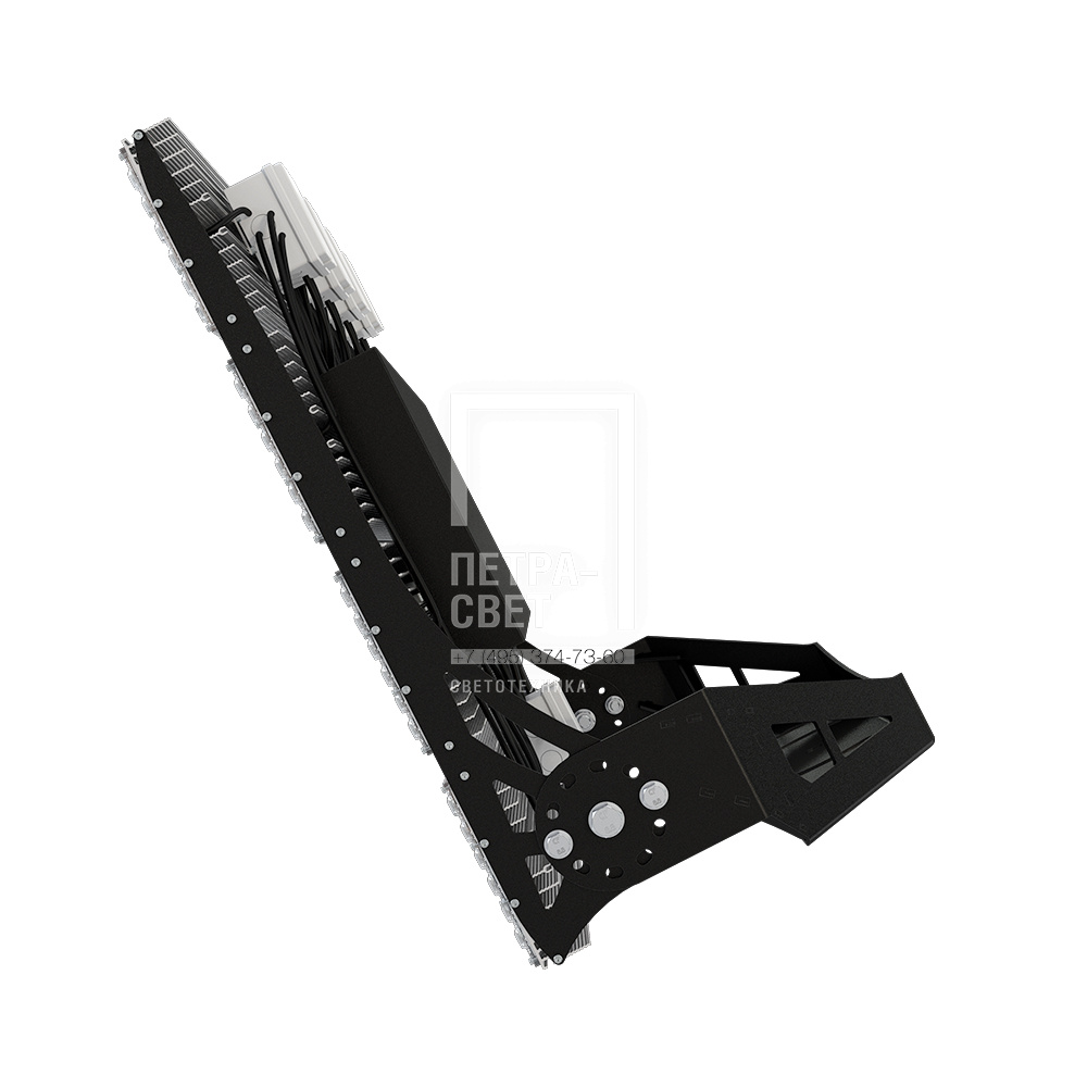 Серия промышленных светодиодных прожекторов для освещения: • футбольных полей; • крытых спортивных площадок; • складов и производственных помещений; • портов и подобных больших территорий; • открытых парковок. Серия «Плазма S» – это универсальные прожекторы c высокой эффективностью (до 163 лм/Вт) и широким набором оптик. За счёт улучшенной конструкции прожекторы обладают малыми весом и габаритами. У «Плазм S» есть модификация Box, в которой источники питания размещаются в монтажном шкафу. Также это исполнение имеет поворотные модули, которые можно ориентировать независимо друг от друга в разных направлениях. Количество модулей варьируется в зависимости от мощности светильника. [Светодиодный модуль] Светодиодный модуль состоит из мощных светодиодов, адаптированных под работу в том числе с узкой оптикой. Светодиоды установлены методом поверхностного монтажа на плату с алюминиевой основой, что обеспечивает эффективный отвод тепла от диодов к корпусу-радиатору. [Источник питания] Источник питания наружного исполнения, его металлический корпус залит теплопроводящим компаундом. За счёт этого снижается нагрев светодиодного модуля и самого источника питания, поэтому светильник служит дольше. Также источник защищён от микросекундных импульсов высокой энергии. Это позволяет сохранять работоспособность светильника даже при появлении в сети посторонних помех. [Линза] Линза изготовлена из УФ-стабилизированного поликарбоната, который не мутнеет, не желтеет и не трескается при эксплуатации на улице. [Корпус] Экструдированный корпус из анодированного алюминия имеет большую площадь поверхности, что обеспечивает эффективное теплоотведение от светодиодов. [Кронштейн] В комплекте идёт кронштейн, который позволяет регулировать угол наклона светильников. Специальные зубцы на кронштейнах дополнительно облегчают регулировку положения прожектора.