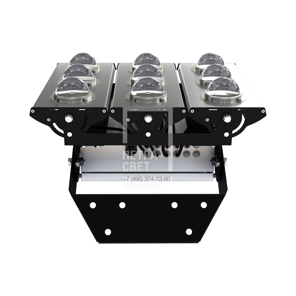 Серия мощных светодиодных прожекторов для освещения: • складов и производственных помещений, • спортивных объектов, • портов и подобных больших территорий, • открытых парковок. Ключевые особенности светильников: • боросиликатная линза, которая не мутнеет, не желтеет и не царапается, • наличие отдельного пылевлагозащищенного монтажного шкафа, где размещаются источники питания. Диапазон мощностей – 300-1500 Вт. Серия «Плазма v2.0» – родоначальница линейки мощных светодиодных прожекторов PromLED: она надёжна и проверена временем (производится с 2017 года). [Светодиодный модуль] Светодиодная плата изготовлена по технологии COB. [Источник питания] Источник питания в металлическом корпусе залит теплопроводящим компаундом, что снижает температуру на его элементах и увеличивает срок службы источника. Источники питания размещаются в специальном монтажном шкафу, который крепится на корпус светильника. За счёт наружного исполнения источника снижается нагрев светодиодного модуля, и сам светильник служит дольше. Также источник питания защищён от микросекундных импульсов высокой энергии до 6 кВ, что позволит сохранить работоспособность светильника даже при появлении в сети посторонних помех. [Линза] Линза из боросиликатного стекла, которая не мутнеет, не желтеет и не царапается. Варианты оптики: 45, 60, 90 и 120 градусов. [Корпус] Экструдированный корпус из анодированного алюминия имеет большую площадь поверхности, что обеспечивает эффективное теплоотведение от светодиодов. [Кронштейн] Светильник комплектуется поворотным кронштейном, позволяющим регулировать угол наклона прожектора.