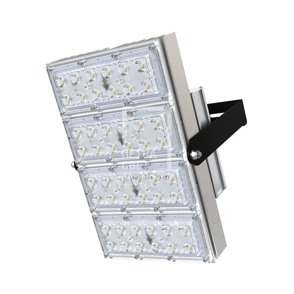 Серия светодиодных прожекторов преимущественно для освещения различных спортивных объектов. Модели «Прожектор S CRI90 5700 К» - это эффективные светильники с высоким индексом цветопередачи и КЦТ 5700 К: такие прожекторы соответствуют требованиям «Матч ТВ» для проведения видеосъемки. Серия обладает широкими набором оптик и мощностным рядом. За счёт улучшенной конструкции «Прожекторы S CRI90 5700 К» обладают малыми весом и габаритами. [Светодиодный модуль] Светодиодный модуль состоит из мощных светодиодов, адаптированных под работу в том числе с узкой оптикой. Светодиоды установлены методом поверхностного монтажа на плату с алюминиевой основой, что обеспечивает эффективный отвод тепла от диодов к корпусу-радиатору. [Источник питания] Источник питания наружного исполнения, его металлический корпус залит теплопроводящим компаундом. Это снижает температуру на элементах источника питания, увеличивая срок его службы. Кроме того, за счёт наружного исполнения источника снижается нагрев светодиодного модуля, и сам светильник служит дольше. Также источник питания защищён от микросекундных импульсов высокой энергии от 10 до 15 кВ, что позволит сохранить работоспособность светильника даже при появлении в сети посторонних помех. [Линза] Линза изготовлена из УФ-стабилизированного поликарбоната, который не мутнеет, не желтеет и не трескается при эксплуатации в том числе на улице. [Корпус] Экструдированный корпус из анодированного алюминия имеет большую площадь поверхности, что обеспечивает эффективное теплоотведение от светодиодов. [Кронштейн] В комплекте идёт кронштейн, который позволяет регулировать угол наклона прожектора. Специальные зубцы на кронштейнах (для светильников 200-300 Вт) дополнительно облегчают регулировку положения прожектора.