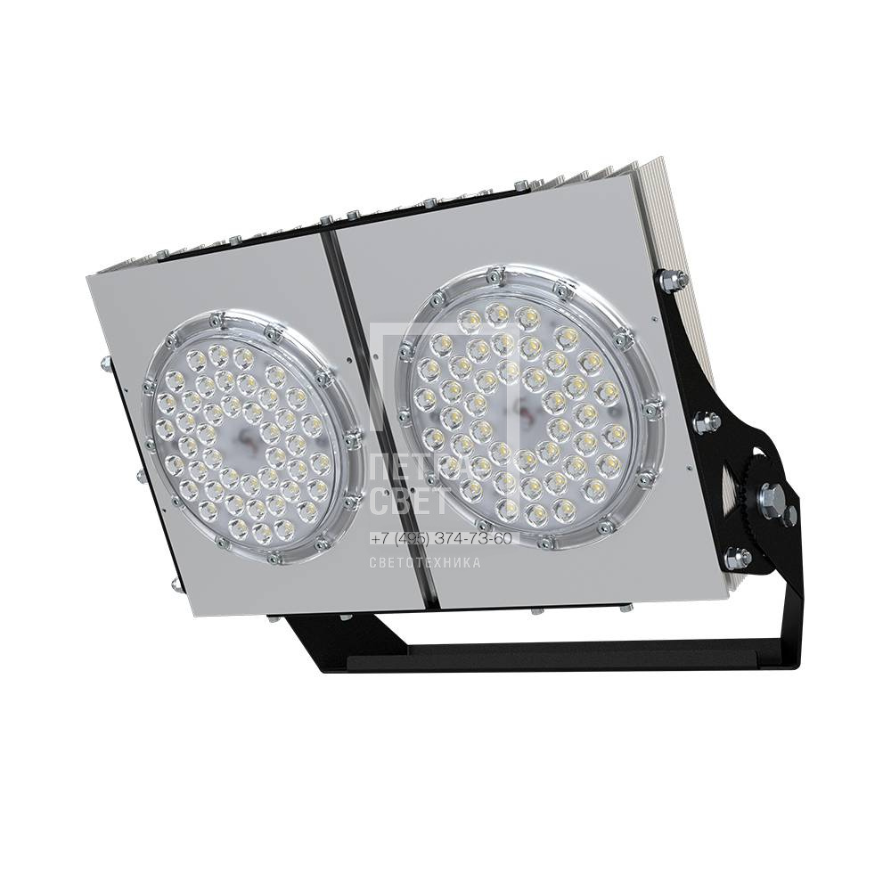 Серия промышленных светодиодных прожекторов для освещения: • спортивных площадок, бассейнов, теннисных кортов; • площадей, открытых парковок; • складов, • производственных помещений. Прожекторы малых мощностей могут использоваться в том числе и в архитектурном освещении. Серия «Прожектор D» – это светильники с высокой энергоэффективностью (до 185 лм/Вт) и круглыми линзами. Прожекторы имеют оптимальное соотношение эффективности и цены за люмен, а широкий мощностной ряд позволяет решать самые разные светотехнические задачи. [Корпус] Экструдированный корпус из анодированного алюминия имеет большую площадь поверхности, что обеспечивает эффективное теплоотведение от светодиодов. [Светодиодный модуль] Светодиодный модуль содержит значительное количество диодов, равномерно распределённых по большой площади. За счёт этого снижается габаритная яркость и обеспечивается комфортное неслепящее освещение. Светодиоды работают при низких токах (50% от номинальных и ниже), что повышает эффективность светильника и увеличивает срок его службы. [Линза] Линза изготовлена из УФ-стабилизированного поликарбоната, который не мутнеет, не желтеет и не трескается при эксплуатации на улице. [Источник питания] Источник питания наружного исполнения, его металлический корпус залит теплопроводящим компаундом. За счёт этого снижается нагрев светодиодного модуля и самого источника питания, поэтому светильник служит дольше. Также источник питания защищён от микросекундных импульсов высокой энергии. Это позволяет сохранять работоспособность светильника даже при появлении в сети посторонних помех. [Крепление] В комплекте идёт кронштейн, который позволяет регулировать угол наклона светильников. Специальные зубцы на кронштейнах (для светильников 200-300 Вт) дополнительно облегчают регулировку положения прожектора.