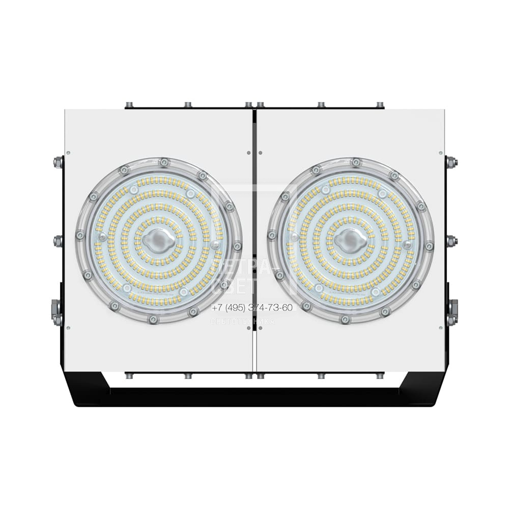 Серия промышленных светодиодных прожекторов для освещения: • спортивных площадок, бассейнов, теннисных кортов; • площадей, открытых парковок; • складов, • производственных помещений. Прожекторы малых мощностей могут использоваться в том числе и в архитектурном освещении. Серия «Прожектор D» – это светильники с высокой энергоэффективностью (до 185 лм/Вт) и круглыми линзами. Прожекторы имеют оптимальное соотношение эффективности и цены за люмен, а широкий мощностной ряд позволяет решать самые разные светотехнические задачи. [Корпус] Экструдированный корпус из анодированного алюминия имеет большую площадь поверхности, что обеспечивает эффективное теплоотведение от светодиодов. [Светодиодный модуль] Светодиодный модуль содержит значительное количество диодов, равномерно распределённых по большой площади. За счёт этого снижается габаритная яркость и обеспечивается комфортное неслепящее освещение. Светодиоды работают при низких токах (50% от номинальных и ниже), что повышает эффективность светильника и увеличивает срок его службы. [Линза] Линза изготовлена из УФ-стабилизированного поликарбоната, который не мутнеет, не желтеет и не трескается при эксплуатации на улице. [Источник питания] Источник питания наружного исполнения, его металлический корпус залит теплопроводящим компаундом. За счёт этого снижается нагрев светодиодного модуля и самого источника питания, поэтому светильник служит дольше. Также источник питания защищён от микросекундных импульсов высокой энергии. Это позволяет сохранять работоспособность светильника даже при появлении в сети посторонних помех. [Крепление] В комплекте идёт кронштейн, который позволяет регулировать угол наклона светильников. Специальные зубцы на кронштейнах (для светильников 200-300 Вт) дополнительно облегчают регулировку положения прожектора.