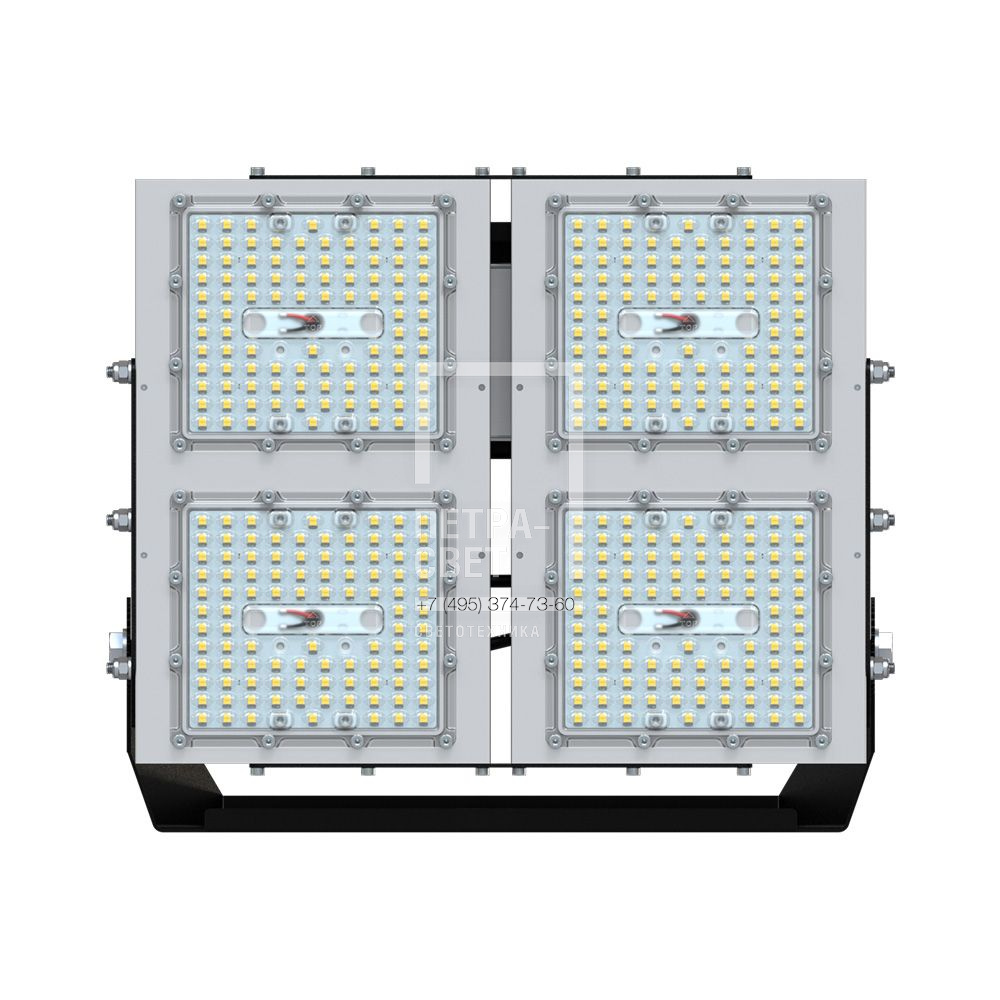 Серия промышленных светодиодных прожекторов для освещения: • футбольных полей, • крытых спортивных площадок, • складов и производственных помещений, • портов и подобных больших территорий, • открытых парковок. Прожекторы малых мощностей могут использоваться в том числе и в архитектурном освещении. Серия «Прожектор S» – это универсальные светильники c высокой эффективностью (до 173 лм/Вт), широким набором оптик и мощностей. За счёт улучшенной конструкции «Прожекторы S» обладают малыми весом и габаритами. [Корпус] Экструдированный корпус из анодированного алюминия имеет большую площадь поверхности, что обеспечивает эффективное теплоотведение от светодиодов. [Светодиодный модуль] Светодиодный модуль состоит из мощных светодиодов, адаптированных под работу в том числе с узкой оптикой. Светодиоды установлены методом поверхностного монтажа на плату с алюминиевой основой, что обеспечивает эффективный отвод тепла от диодов к корпусу-радиатору. [Линза] Линза изготовлена из УФ-стабилизированного поликарбоната, который не мутнеет, не желтеет и не трескается при эксплуатации в том числе на улице. [Источник питания] Источник питания наружного исполнения, его металлический корпус залит теплопроводящим компаундом. Это снижает температуру на элементах источника питания, увеличивая срок его службы. Кроме того, за счёт наружного исполнения источника снижается нагрев светодиодного модуля, и сам светильник служит дольше. Также источник питания защищён от микросекундных импульсов высокой энергии, что позволит сохранить работоспособность светильника даже при появлении в сети посторонних помех. [Кронштейн] В комплекте идёт кронштейн, который позволяет регулировать угол наклона прожектора. Специальные зубцы на кронштейнах (для светильников 200-300 Вт) дополнительно облегчают регулировку положения прожектора.