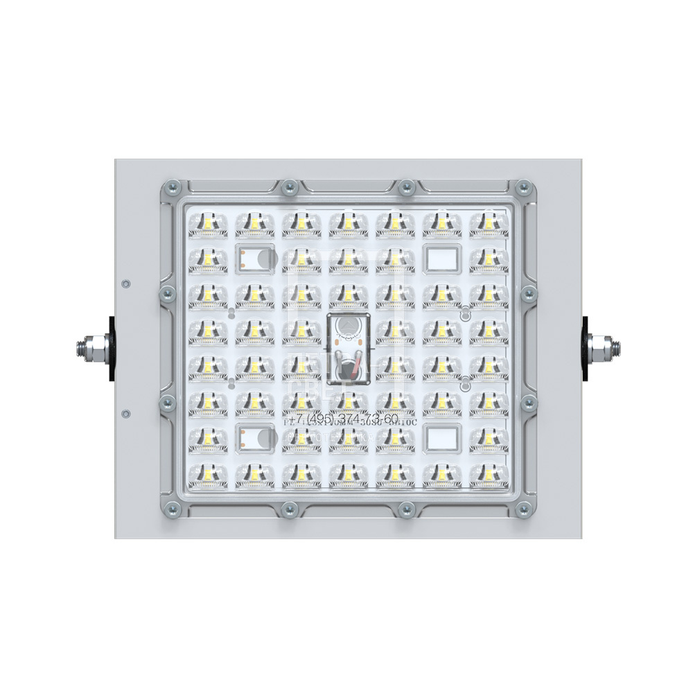 Серия промышленных светодиодных прожекторов для освещения: • футбольных полей, • крытых спортивных площадок, • складов и производственных помещений, • портов и подобных больших территорий, • открытых парковок. Прожекторы малых мощностей могут использоваться в том числе и в архитектурном освещении. Серия «Прожектор S» – это универсальные светильники c высокой эффективностью (до 173 лм/Вт), широким набором оптик и мощностей. За счёт улучшенной конструкции «Прожекторы S» обладают малыми весом и габаритами. [Корпус] Экструдированный корпус из анодированного алюминия имеет большую площадь поверхности, что обеспечивает эффективное теплоотведение от светодиодов. [Светодиодный модуль] Светодиодный модуль состоит из мощных светодиодов, адаптированных под работу в том числе с узкой оптикой. Светодиоды установлены методом поверхностного монтажа на плату с алюминиевой основой, что обеспечивает эффективный отвод тепла от диодов к корпусу-радиатору. [Линза] Линза изготовлена из УФ-стабилизированного поликарбоната, который не мутнеет, не желтеет и не трескается при эксплуатации в том числе на улице. [Источник питания] Источник питания наружного исполнения, его металлический корпус залит теплопроводящим компаундом. Это снижает температуру на элементах источника питания, увеличивая срок его службы. Кроме того, за счёт наружного исполнения источника снижается нагрев светодиодного модуля, и сам светильник служит дольше. Также источник питания защищён от микросекундных импульсов высокой энергии, что позволит сохранить работоспособность светильника даже при появлении в сети посторонних помех. [Кронштейн] В комплекте идёт кронштейн, который позволяет регулировать угол наклона прожектора. Специальные зубцы на кронштейнах (для светильников 200-300 Вт) дополнительно облегчают регулировку положения прожектора.