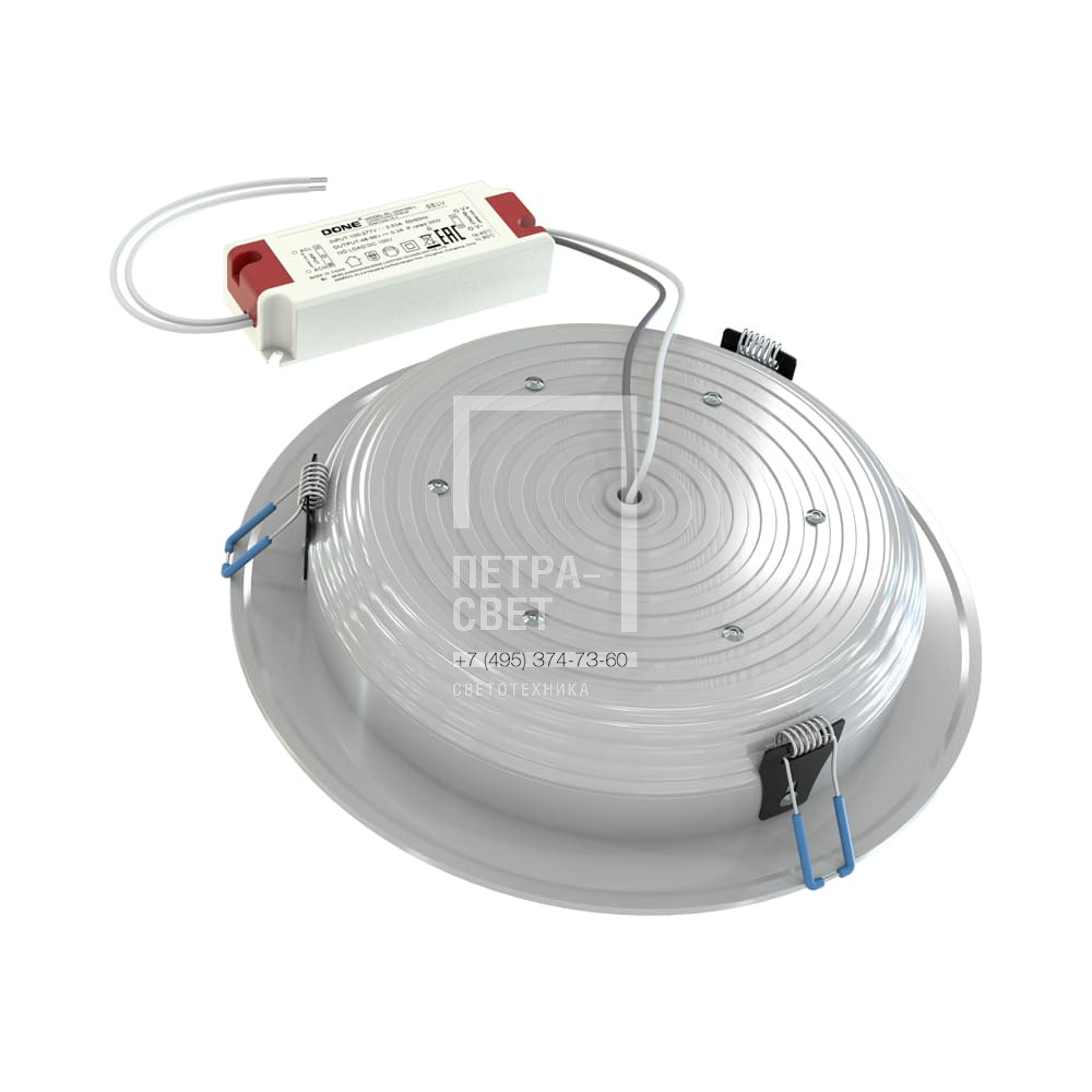 Серия встраиваемых светодиодных светильников для освещения: • торговых, офисных и административных помещений, • конференц-залов, • холлов и коридоров. Рекомендуемая высота установки светильника 2-10 метров. Бюджетная модель светильников для встраиваемого монтажа со световой эффективностью до 120 лм/Вт. Серия отличается малыми размерами, простым монтажом и широким мощностным рядом (от 5 до 50 Вт). [Светодиодный модуль] В светильниках используются светодиодные платы круглой формы из алюминия, что позволяет равномерно и эффективно отводить тепло от светодиодов. [Корпус] Алюминиевый корпус с порошковой окраской имеет три типоразмера: S, M и L. Стандартная степень защиты от влаги и пыли IP20, под заказ возможно исполнение с IP54. [Источник питания] Эффективные источники питания наружного исполнения. [Рассеиватель] Опаловый рассеиватель позволяет добиться мягкого и комфортного освещения. [Крепления] Светильник устанавливается в монтажное отверстие с помощью специальных зажимных пружин.