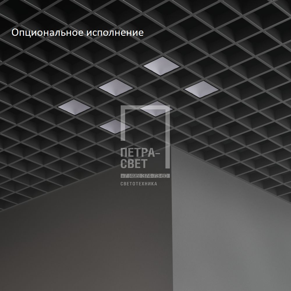 Серия встраиваемых светодиодных светильников для освещения общественных пространств: • офисных помещений, холлов и зон ресепшен, • концертных залов и арт-пространств, • торговых объектов, • административных помещений и т.д. Особенности серии: • «Грильято Мозаик» не только обеспечивает полноценное освещение, но и позволяет создавать индивидуальные светотехнические проекты, например, узоры в сетке потолка; • Литой пластиковый корпус, обеспечивающий привлекательный внешний вид и малый вес светильников; • Простой монтаж и уникальные крепления собственной разработки, которые подходят к любым типовым потолочным профилям. Возможные опции: • исполнение с блоком аварийного питания на 1,5 или 3 часа, • исполнение с индексом цветопередачи CRI90, • исполнение с повышенной степенью пыле- и влагозащиты IP54. [Корпус] Корпус изготавливается из ABS-пластика методом литья под давлением. Цвет корпуса – белый. [Светодиодный модуль] SMT светодиодная плата на алюминиевой подложке. [Источник питания] Источник питания наружного исполнения в пластиковом корпусе. К одному драйверу подключаются несколько светильников в зависимости от комплектации, максимальное количество 7 штук. [Рассеиватель] Рассеиватель из УФ-стабилизированного поликарбоната. [Крепление] Светильники предназначены для встраиваемого монтажа в потолок типа «Грильято» с ячейкой 100х100 мм. В комплекте со светильниками поставляется набор пластиковых монтажных скоб. Скобы спроектированы таким образом, что подойдут к любой типовой высоте потолочного профиля (30, 40 и 50 мм).