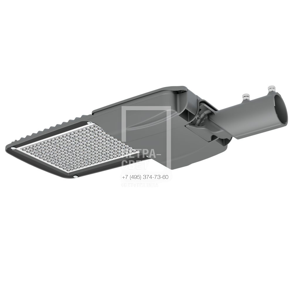 Серия консольных светодиодных светильников для освещения: • автомагистралей, широкополосных дорог, шоссе, • улиц и кварталов, • площадей, • наружных территорий промышленных объектов. Особенности светильников «Гроза М v2»: • самая высокая световая отдача в семействе «Гроза» – до 185 лм/Вт; • литой корпус с доступом в отсек коммутации без инструмента – удобное обслуживание светильника; • улучшенный теплоотвод по сравнению с предыдущим поколением «Гроз М»; • возможность горячей замены источника питания; • совместимость с различными системами управления (NEMA и Zhaga разъёмы (опционально)). Светильники соответствуют современным требованиям крупных заказчиков (в т.ч. государственных компаний) к энергоэффективности, светораспределению, форм-фактору и совместимости с системами управления. [Корпус] Литой корпус изготовлен из алюминия и покрыт порошковой краской. С помощью специальных силиконовых уплотнителей корпус надёжно защищён от пыли и влаги. Конструкция корпуса позволяет открывать отсек коммутации без дополнительных инструментов прямо на месте установки светильника – для этого предусмотрены специальные защёлки. Крышка отсека коммутации выполнена съёмной – это позволяет производить горячую замену источника питания светильника. [Светодиодный модуль] Алюминиевая светодиодная плата изготовлена по SMT-технологии с использованием большого количества светодиодов (240 штук) – это обеспечивает высокую световую отдачу, малую габаритную яркость и комфортное неслепящее освещение. Светодиоды работают при низких токах (50% от номинальных и ниже), что повышает эффективность светильника и увеличивает срок его службы. [Линза] Модульная оптика из ПММА специально разработана под семейство светильников «Гроза». Таким образом, оптическая система «светодиод-линза» создает КСС, обеспечивающую оптимальные яркость, коэффициенты ослеплённости и периферийности, равномерность освещения. [Закалённое стекло] Установленное в базовой комплектации закалённое стекло защищает линзу от загрязнений и агрессивного внешнего воздействия, а также упрощает процесс очистки светильника. [Источник питания] Источник питания выполнен в металлическом корпусе и залит теплопроводящим компаундом – за счёт этого снижается нагрев компонентов источника, поэтому он служит дольше. У светильника есть возможность горячей замены источника питания – без демонтажа светильника с опоры и отключения его от питающей сети. Источник питания защищён от микро- и наносекундных импульсов высокой энергии до 15 кВ. [Крепление] Светильники оснащены поворотным креплением, которое позволяет устанавливать их как на консольную, так и на торшерную опору диаметром от 45 до 60 мм. С помощью крепления можно регулировать угол наклона светильника в диапазоне ±20° с шагом 5°.
