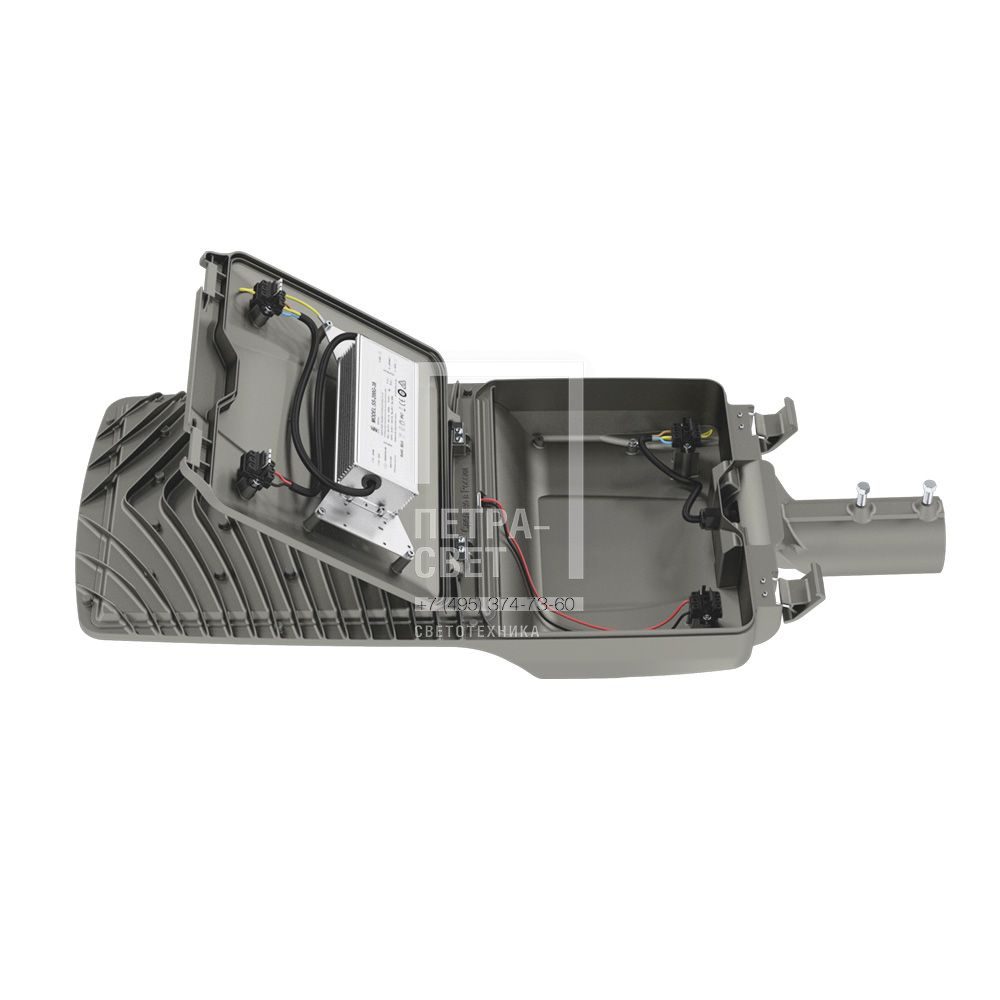 Серия консольных светодиодных светильников для освещения: - автомагистралей, широкополосных дорог, шоссе, - улиц и кварталов, - площадей, - наружных территорий промышленных объектов и т.д. Особенности светильников «Гроза L v2»: · высокая световая отдача – до 175 лм/Вт; · литой корпус с доступом в отсек коммутации без инструмента – удобное обслуживание светильника; · улучшенный теплоотвод по сравнению с предыдущим поколением «Гроз L»; · возможность горячей замены источника питания; · совместимость с различными системами управления (NEMA и Zhaga разъёмы (опционально)). Светильники соответствуют современным требованиям крупных заказчиков (в т.ч. государственных компаний) к энергоэффективности, светораспределению, форм-фактору и совместимости с системами управления. [Корпус] Литой корпус изготовлен из алюминия и покрыт порошковой краской. С помощью специальных силиконовых уплотнителей корпус надёжно защищён от пыли и влаги. Конструкция корпуса позволяет открывать отсек коммутации без дополнительных инструментов прямо на месте установки светильника – для этого предусмотрены специальные защёлки. Крышка отсека коммутации выполнена съёмной – это позволяет производить горячую замену источника питания светильника. [Светодиодный модуль] Алюминиевая светодиодная плата изготовлена по SMT-технологии с использованием большого количества светодиодов (400 штук) – это обеспечивает высокую световую отдачу, малую габаритную яркость и комфортное неслепящее освещение. Светодиоды работают при низких токах (50% от номинальных и ниже), что повышает эффективность светильника и увеличивает срок его службы. [Линза] Модульная оптика из ПММА специально разработана под семейство светильников «Гроза». Таким образом, оптическая система «светодиод-линза» создает КСС, обеспечивающую оптимальные яркость, коэффициенты ослеплённости и периферийности, равномерность освещения. [Закалённое стекло] Установленное в базовой комплектации закалённое стекло защищает линзу от загрязнений и агрессивного внешнего воздействия, а также упрощает процесс очистки светильника. [Источник питания] Источник питания выполнен в металлическом корпусе и залит теплопроводящим компаундом – за счёт этого снижается нагрев компонентов источника, поэтому он служит дольше. У светильника есть возможность горячей замены источника питания – без демонтажа светильника с опоры и отключения его от питающей сети. Источник питания защищён от микро- и наносекундных импульсов высокой энергии до 15 кВ. [Крепление] Светильники оснащены поворотным креплением, которое позволяет устанавливать их как на консольную, так и на торшерную опору диаметром от 45 до 60 мм. С помощью крепления можно регулировать угол наклона светильника в диапазоне ±20° с шагом 5°.