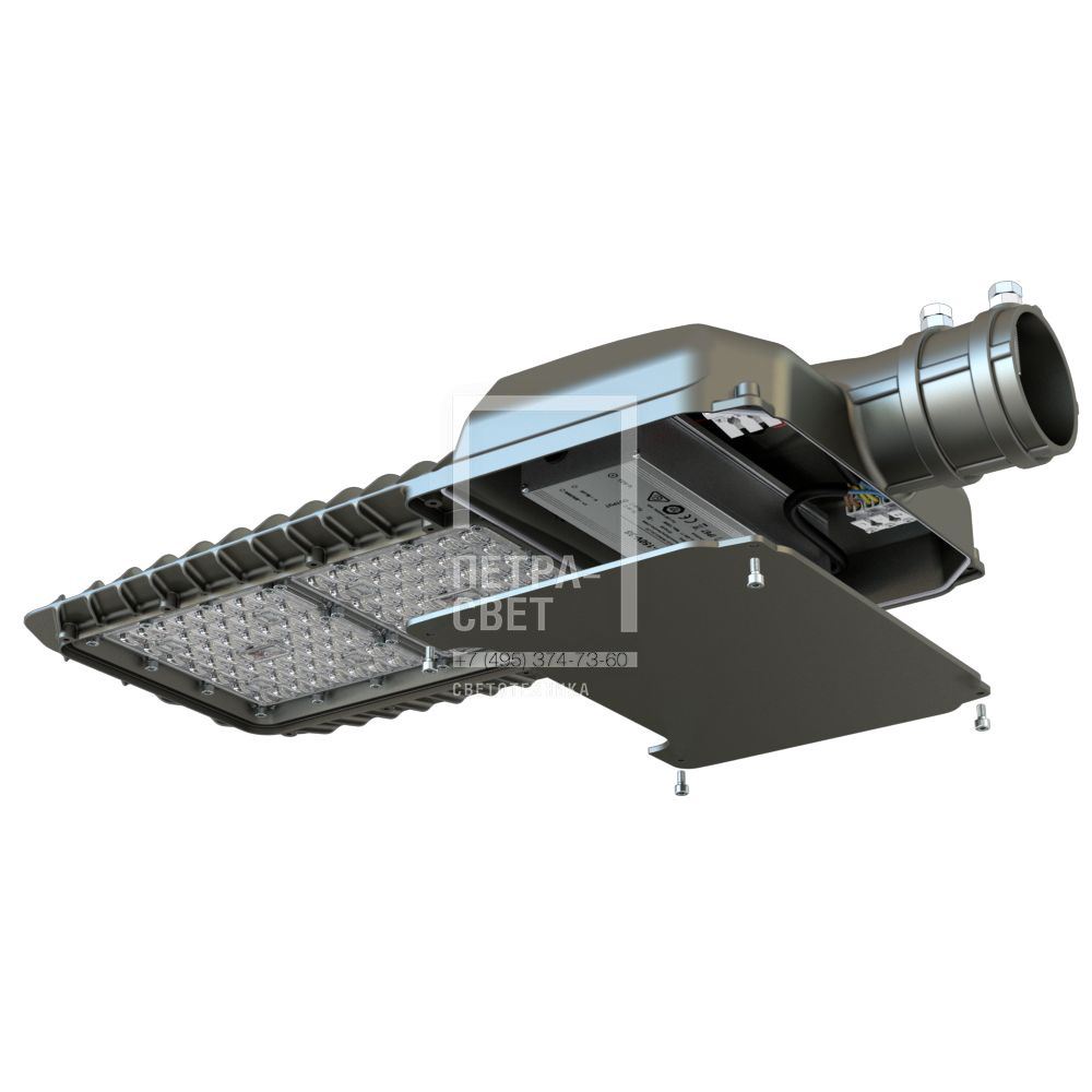 Серия светодиодных светильников для освещения: • автомагистралей, широкополосных шоссе, • улиц и дорог местного значения, • кварталов и площадей, • придомовых и дворовых территорий, • наружных площадок промышленных объектов. Преимущества серии: • литой корпус с оптимизированным радиатором для отвода тепла от светодиодов; • малый вес; • выгодная цена; • высокая энергоэффективность до 170 лм/Вт; • закалённое стекло (опционально); • два типа линз – 135х55° и 155х70°; • совместимость с различными системами управления (NEMA и Zhaga разъёмы (опционально)). Светодиодный модуль Две алюминиевые светодиодные платы, изготовленные по SMT-технологии (135х55° – 50 светодиодов, 155х70° – 99 светодиодов). Светодиоды работают при низких токах (50% от номинальных и ниже), что повышает эффективность светильника и увеличивает срок его службы. Корпус Литой алюминиевый корпус, покрытый порошковой краской, обеспечивает малые габариты и вес, а также эстетичный внешний вид. Специальные силиконовые уплотнители защищают корпус от проникновения внутрь пыли и влаги. Корпус имеет большое количество рёбер для эффективного отведения тепла от светодиодов. Источник питания Источник питания в металлическом корпусе залит теплопроводящим компаундом, за счёт чего снижается нагрев его компонентов, и источник питания служит дольше. Защита от микро- и наносекундных импульсов высокой энергии до 15 кВ. Линза Оптика изготовлена из УФ-стабилизированного поликарбоната. Светильники могут комплектоваться двумя типами линз: 135х55° и 155х70°. Светопропускание не менее 94%. Крепление С помощью консольного крепления светильники устанавливаются на опору круглого сечения диаметром до 60 мм. Для возможности регулировки угла наклона светильники могут комплектоваться поворотным креплением.