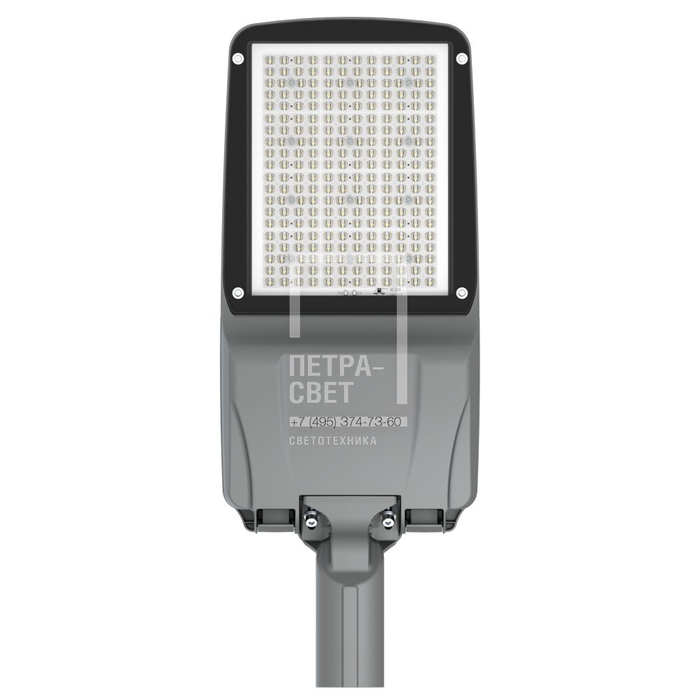 Серия консольных светодиодных светильников для освещения: • автомагистралей, широкополосных дорог, шоссе, • улиц и кварталов, • площадей, • наружных территорий промышленных объектов. Особенности светильников «Гроза М v2»: • самая высокая световая отдача в семействе «Гроза» – до 185 лм/Вт; • литой корпус с доступом в отсек коммутации без инструмента – удобное обслуживание светильника; • улучшенный теплоотвод по сравнению с предыдущим поколением «Гроз М»; • возможность горячей замены источника питания; • совместимость с различными системами управления (NEMA и Zhaga разъёмы (опционально)). Светильники соответствуют современным требованиям крупных заказчиков (в т.ч. государственных компаний) к энергоэффективности, светораспределению, форм-фактору и совместимости с системами управления. [Корпус] Литой корпус изготовлен из алюминия и покрыт порошковой краской. С помощью специальных силиконовых уплотнителей корпус надёжно защищён от пыли и влаги. Конструкция корпуса позволяет открывать отсек коммутации без дополнительных инструментов прямо на месте установки светильника – для этого предусмотрены специальные защёлки. Крышка отсека коммутации выполнена съёмной – это позволяет производить горячую замену источника питания светильника. [Светодиодный модуль] Алюминиевая светодиодная плата изготовлена по SMT-технологии с использованием большого количества светодиодов (240 штук) – это обеспечивает высокую световую отдачу, малую габаритную яркость и комфортное неслепящее освещение. Светодиоды работают при низких токах (50% от номинальных и ниже), что повышает эффективность светильника и увеличивает срок его службы. [Линза] Модульная оптика из ПММА специально разработана под семейство светильников «Гроза». Таким образом, оптическая система «светодиод-линза» создает КСС, обеспечивающую оптимальные яркость, коэффициенты ослеплённости и периферийности, равномерность освещения. [Закалённое стекло] Установленное в базовой комплектации закалённое стекло защищает линзу от загрязнений и агрессивного внешнего воздействия, а также упрощает процесс очистки светильника. [Источник питания] Источник питания выполнен в металлическом корпусе и залит теплопроводящим компаундом – за счёт этого снижается нагрев компонентов источника, поэтому он служит дольше. У светильника есть возможность горячей замены источника питания – без демонтажа светильника с опоры и отключения его от питающей сети. Источник питания защищён от микро- и наносекундных импульсов высокой энергии до 15 кВ. [Крепление] Светильники оснащены поворотным креплением, которое позволяет устанавливать их как на консольную, так и на торшерную опору диаметром от 45 до 60 мм. С помощью крепления можно регулировать угол наклона светильника в диапазоне ±20° с шагом 5°.