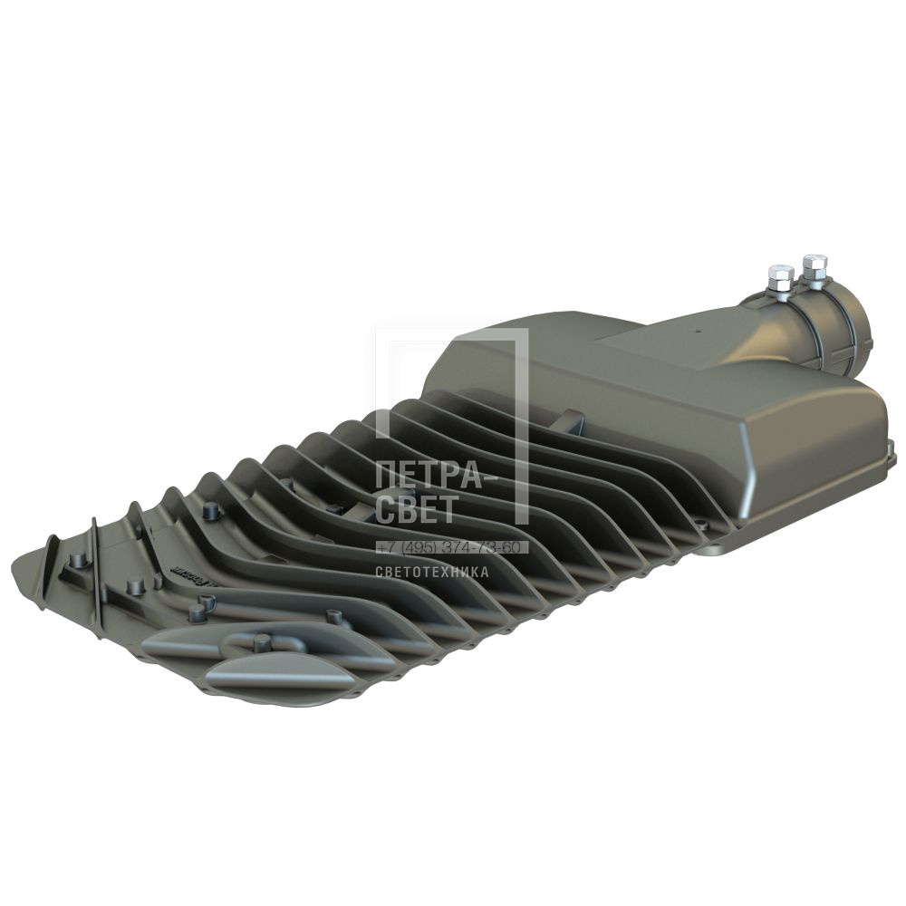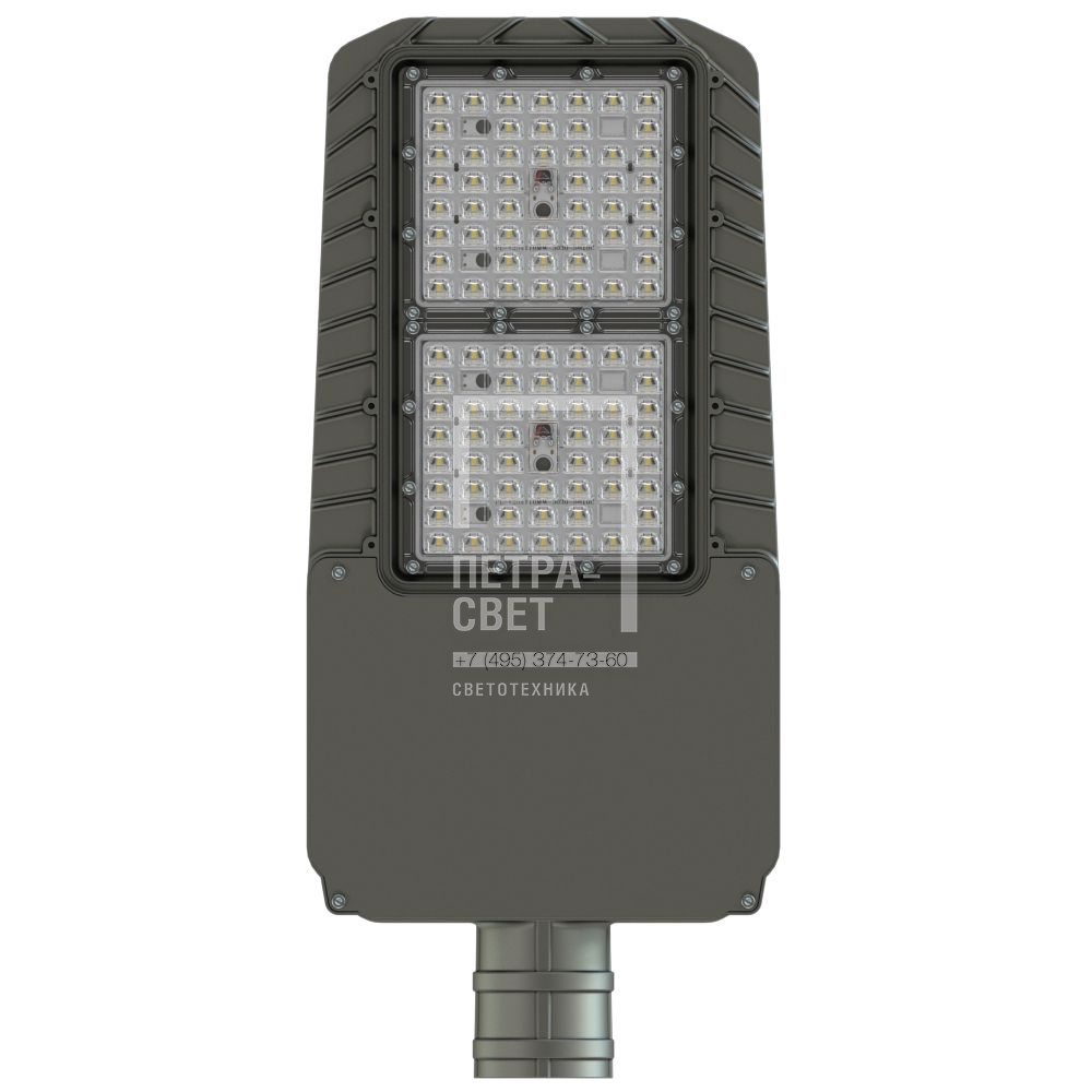 Серия светодиодных светильников для освещения: • автомагистралей, широкополосных шоссе, • улиц и дорог местного значения, • кварталов и площадей, • придомовых и дворовых территорий, • наружных площадок промышленных объектов. Преимущества серии: • литой корпус с оптимизированным радиатором для отвода тепла от светодиодов; • малый вес; • выгодная цена; • высокая энергоэффективность до 170 лм/Вт; • закалённое стекло (опционально); • два типа линз – 135х55° и 155х70°; • совместимость с различными системами управления (NEMA и Zhaga разъёмы (опционально)). Светодиодный модуль Две алюминиевые светодиодные платы, изготовленные по SMT-технологии (135х55° – 50 светодиодов, 155х70° – 99 светодиодов). Светодиоды работают при низких токах (50% от номинальных и ниже), что повышает эффективность светильника и увеличивает срок его службы. Корпус Литой алюминиевый корпус, покрытый порошковой краской, обеспечивает малые габариты и вес, а также эстетичный внешний вид. Специальные силиконовые уплотнители защищают корпус от проникновения внутрь пыли и влаги. Корпус имеет большое количество рёбер для эффективного отведения тепла от светодиодов. Источник питания Источник питания в металлическом корпусе залит теплопроводящим компаундом, за счёт чего снижается нагрев его компонентов, и источник питания служит дольше. Защита от микро- и наносекундных импульсов высокой энергии до 15 кВ. Линза Оптика изготовлена из УФ-стабилизированного поликарбоната. Светильники могут комплектоваться двумя типами линз: 135х55° и 155х70°. Светопропускание не менее 94%. Крепление С помощью консольного крепления светильники устанавливаются на опору круглого сечения диаметром до 60 мм. Для возможности регулировки угла наклона светильники могут комплектоваться поворотным креплением.